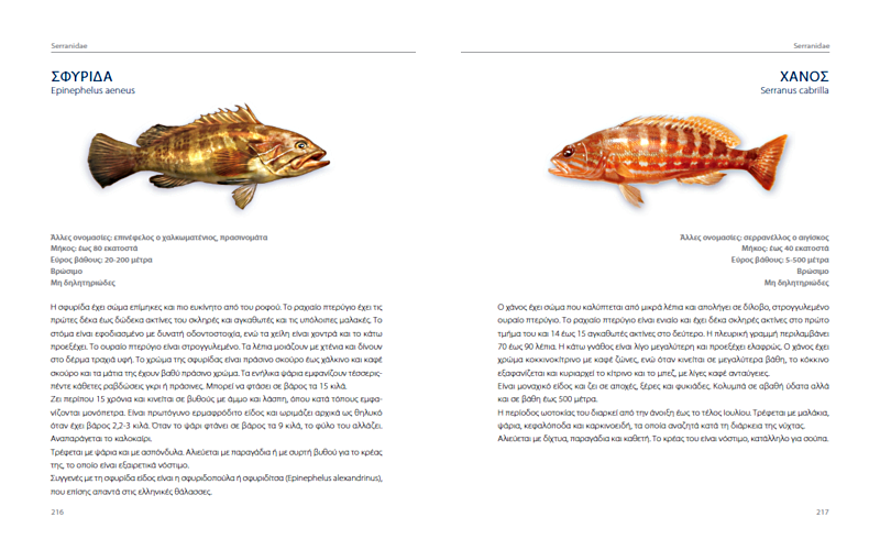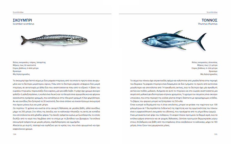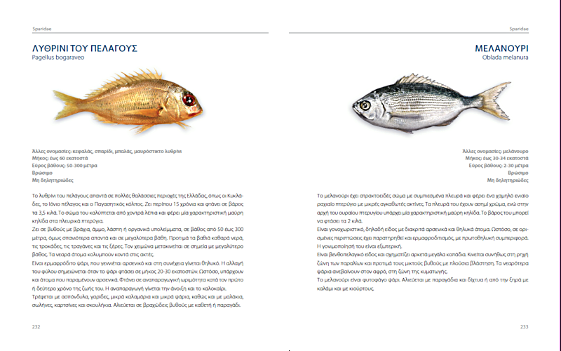 Η εικονογραφημένη έκδοση “Ψάρια των ελληνικών θαλασσών” απευθύνεται σε όλους όσους αγαπούν τη θάλασσα και θα ήθελαν να εμπλουτίσουν τις γνώσεις τους για την ελληνική ιχθυοπανίδα. Παρουσιάζονται τα πιο αντιπροσωπευτικά ψάρια που ζουν στις θάλασσες της Ελλάδας, με περιγραφή της μορφολογίας τους, του τρόπου αναπαραγωγής, των διατροφικών συνηθειών, των βιοτόπων τους, αλλά και των τρόπων αλίευσής τους. Ψάρια που αφθονούν στις ελληνικές θάλασσες, απειλούμενα είδη, αλλά και άλλα που εμφανίστηκαν στη Μεσόγειο τα τελευταία χρόνια, συνθέτουν τον χάρτη ενός κόσμου πολύμορφου και γεμάτου ενδιαφέρον..
