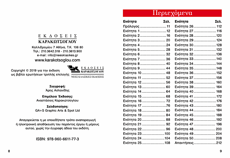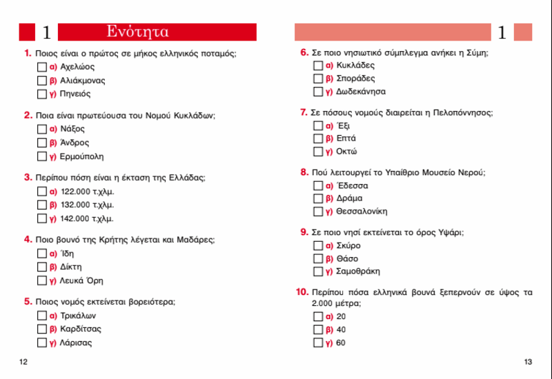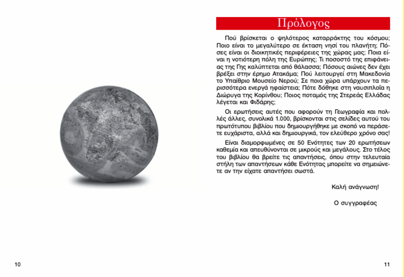 Πού βρίσκεται ο ψηλότερος καταρράκτης του κόσµου; Ποιο είναι το µεγαλύτερο σε έκταση νησί του πλανήτη; Πόσες είναι οι διοικητικές περιφέρειες της χώρας µας; Ποια είναι η νοτιότερη πόλη της Ευρώπης; Τι ποσοστό της επιφάνειας της Γης καλύπτεται από θάλασσα; Πόσους αιώνες δεν έχει βρέξει στην έρηµο Ατακάµα; Πού λειτουργεί στη Μακεδονία το Υπαίθριο Μουσείο Νερού; Σε ποια χώρα υπάρχουν τα περισσότερα ενεργά ηφαίστεια; Πότε δόθηκε στη ναυσιπλοΐα η Διώρυγα της Κορίνθου; Ποιος ποταµός της Στερεάς Ελλάδας λέγεται και Φιδάρης; Αυτές είναι 10 από τις 1.000 ερωτήσεις τριπλής επιλογής που µαζί µε τις απαντήσεις τους περιέχονται σε αυτό το πρωτότυπο βιβλίο και αφορούν τη γεωγραφία! Ένα βιβλίο για µικρούς και µεγάλους, που θα σας κρατήσει συντροφιά στον ελεύθερο χρόνο σας, θα σας διασκεδάσει δηµιουργικά και θα σας πληροφορήσει ευχάριστα!