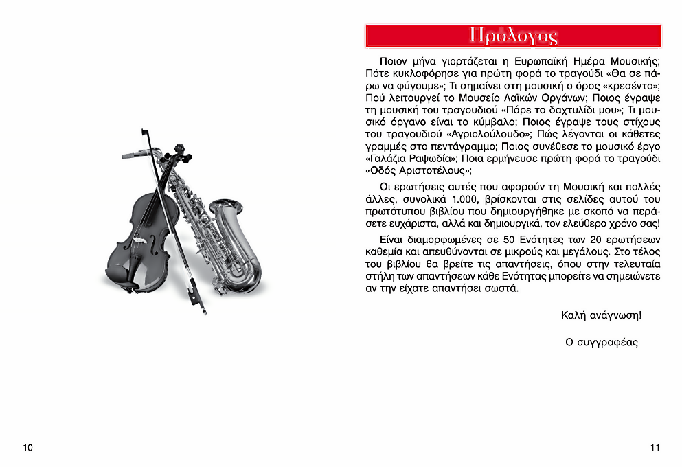 Ένα βιβλίο με 1000 κουίζ γνώσεων μουσικής για µικρούς και µεγάλους, που θα σας κρατήσει συντροφιά στον ελεύθερο χρόνο σας, θα σας διασκεδάσει δηµιουργικά και θα σας πληροφορήσει ευχάριστα!